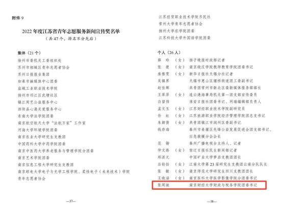 张周驰老师获“2022年度江苏省青年志愿服务新闻宣传奖”,税收2002班张颖获“2022年度江苏省优秀青年志愿者”称号。这也是绿帽小说