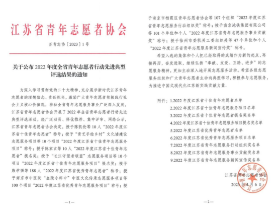 志愿服务项目”荣获“2018年度江苏省优秀青年志愿服务项目”后,志愿服务工作再获省级表彰。