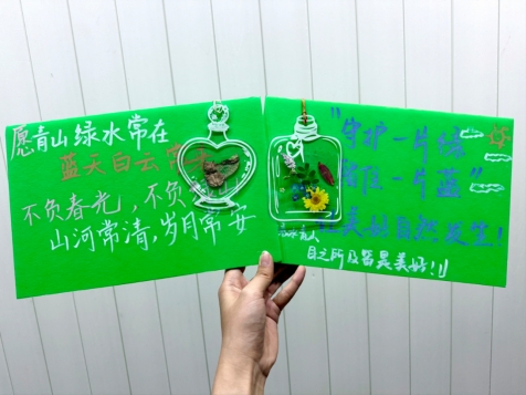 创作完成后,同学们将精美书签悬挂于KT板之上,写下一句句真挚动人的环保寄语,共同打造出一面色彩斑斓、情意满满的作品展示墙。在随后的心得交流环节,大家踊跃发言,分享劳动感悟与创作心得,进一步加深了对生态文明建设的理解与认同。