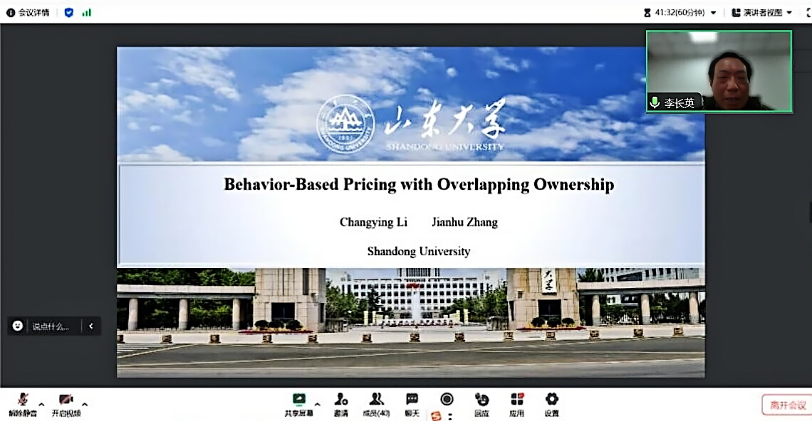 2024315日,特邀山东大学经济学院李长英教授为师生做了题为Behavior-Based Pricing with Overlapping Ownership”(《存在所有权重叠时基于行为的定价》)的线上学术报告会,我院教师及研究生参与了此次讲座,会议由财政与税务学院院长杨继军主持。