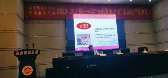 9月27日中午,财政与税务学院、应用数学学院联合开展的2020-2021学年第一学期“党的发展对象”培训班开班典礼在行政楼二楼报告厅举行。我院党委书记陈苏、副书记李慕原,马克思主义学院总支书记陈翔,应用数学学院党总支书记殷建新、院长助理布丹丹及全体党校学员参加了开班典礼。开班典礼由应用数学学院党总支书记殷建新主持。