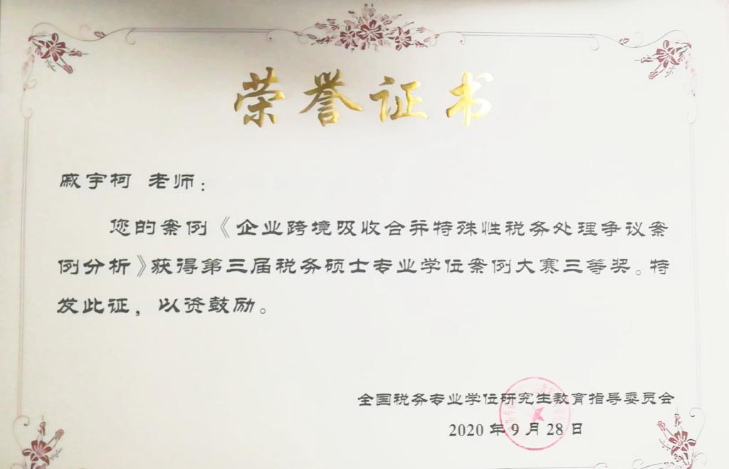 近日,从全国税务(MT)专业学位研究生教育指导委员会传来喜讯,由我院程瑶教授及行业导师江苏国瑞兴光税务师事务所所长高允斌指导,2019级税务硕士研究生戚宇柯同学撰写的案例——《企业跨境吸收合并特殊性税务处理争议案例分析》,在2019-2020年第三届税务硕士专业学位案例大赛中荣获三等奖。