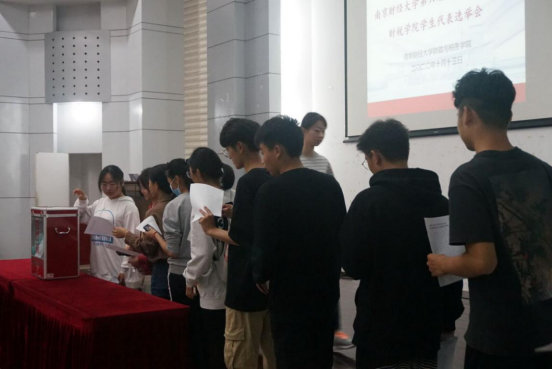 院学生会轮值主席曾丽娟同学发言,她向在场同学介绍了第六次学代会的前期筹备内容、学生代表的职责及我院学生会对此次学代会的推进情况。随后,由各班级推选的15名学生代表依次上台演讲,他们落落大方、充满自信,表达了自己渴望成为学生代表的激情和决心。随后学生代表依次投票,最终产生12名候选代表,他们将代表我院参与南京财经大学第六次学生代表大会。