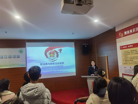 本次“双师课堂”基于我院开设的“中国税制”专业课,恰逢国家宪法日,主要分为《民法典与税收法治关系的理论阐释》和《民法典与税收法治实践(实务操作)》两个部分,由财政与税务学院和国家税务总局南京市税务局第三稽查局联合讲授,课程教学对象是我税收学专业大二年级的大学生普法志愿者。