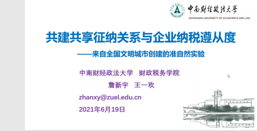6月17日晚上,应财政与税务学院、公共财政研究中心、中国财税治理研究院邀请,中南财经政法大学博士生导师詹新宇教授通过腾讯会议,作了题为“共建共享征纳关系与企业纳税遵从度——来自全国文明城市创建的准自然实验”的线上学术讲座。讲座由财政与税务学院院长、公共财政研究中心主任朱军教授主持,我院部分教师和研究生参加了讲座。