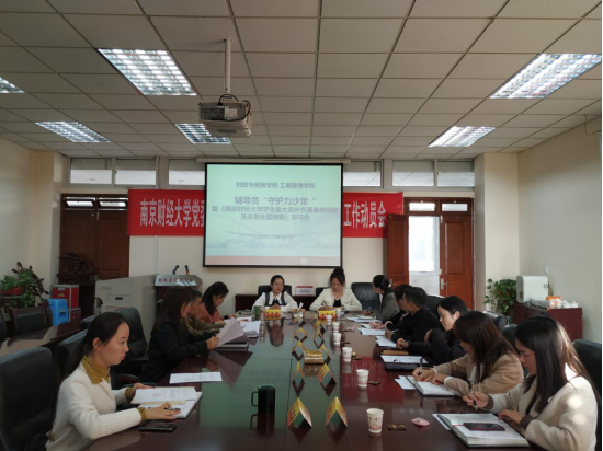 为切实加强我校辅导员队伍建设,提升辅导员队伍专业化、职业化水平,为辅导员提供探讨工作、分享经验的平台,不断提高辅导员队伍的工作能力和业务水平,11月9日下午,我院和工商管理学院在仙林校区德经楼408会议室联合举办辅导员“守护力沙龙”暨《南京财经大学学生重大意外伤害事件预防及应急处置预案》学习会。我院党委副书记李慕原、工商管理学院院长助理全真真及两院全体辅导员、学工人员参加活动,活动由我院党委副书记李慕原主持。