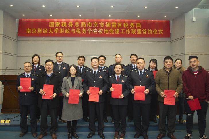 为创新基层组织建设活动形式,强化校地党建统领,实现党建资源共享、优势互补,我院党委与栖霞区税务局机关党委组成校地党建工作联盟,并于11月27日上午在仙林校区行政楼二楼报告厅举行联盟签约仪式。栖霞区税务局党委书记、局长殷壁峰,栖霞区税务局机关党委书记、副局长袁莹,栖霞区税务局机关党委副书记刘德坤,我院党委书记陈苏、副院长(主持工作)朱军,以及栖霞区税务局、学院党员代表参加了仪式。签约仪式由我院分团委书记全真真主持。