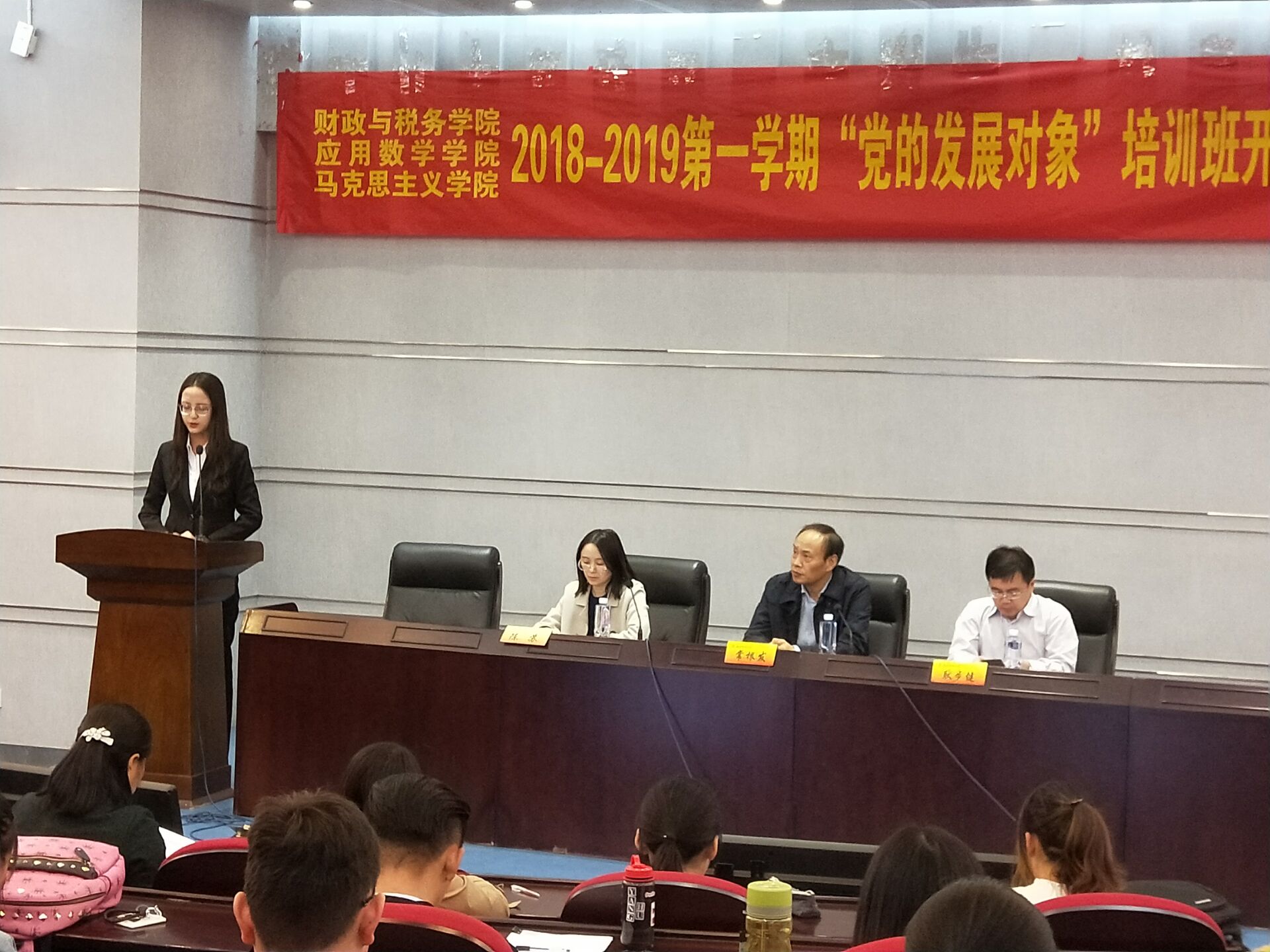 11月2日,我院与应用数学学院、马克思主义学院联合开展的第十一期党校在行政楼2楼报告厅举行了开班仪式暨专题报告会。出席本次开班仪式的有财税院党委书记陈苏、应用数学学院党总支书记常根发、马克思主义学院党总支书记耿步健,全体党校学员参加了开班仪式。开班仪式由财政与税务学院党委书记陈苏主持。