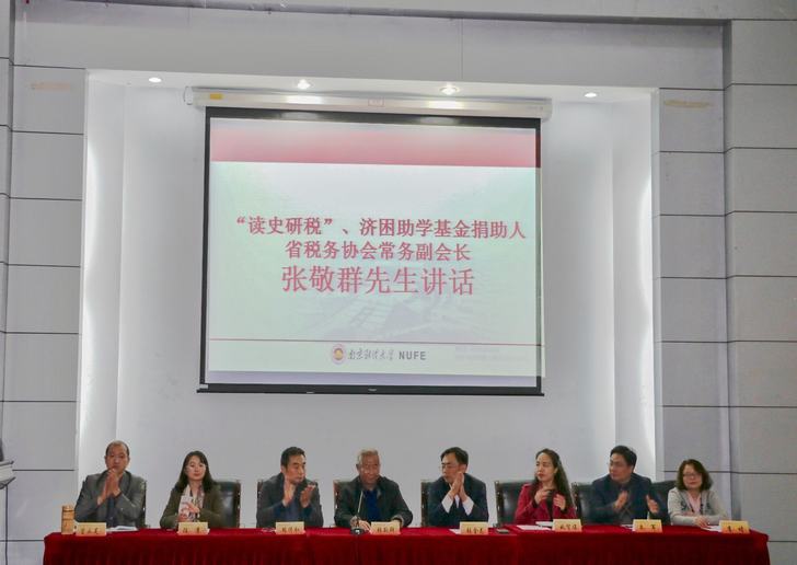 10月16日下午,财政与税务学院在德经楼双登学术报告厅举办了2017级本科生首次入学教育暨“读史研税,济困助学基金”颁奖仪式。江苏省税务学会常务副会长张敬群、副秘书长端传和、南京财经大学校友会秘书处副处长姚智谋、财政与税务学院党委书记张金龙、副院长朱军、党委副书记陈苏、副院长管永昊、财政系主任李婧等出席仪式。获得本次助学基金的学生以及全体2017级大一新生参加了仪式。仪式由党委副书记陈苏主持。