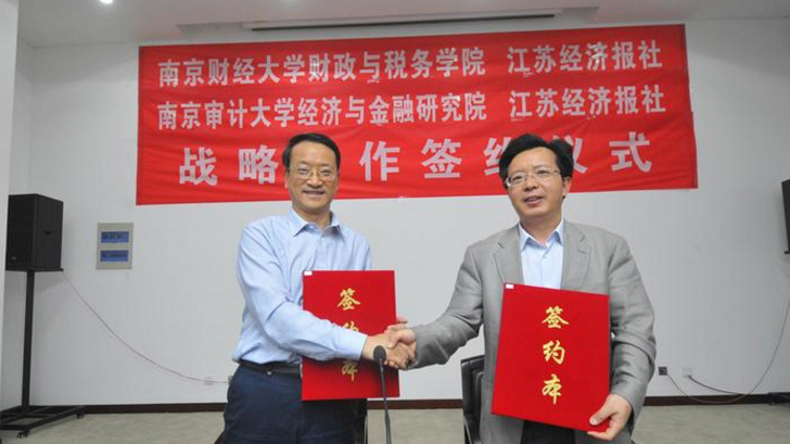 为了更好地服务“强富美高”新江苏建设,实现优势互补、资源共享、共同发展,4月28日下午,江苏经济报社与南京财经大学财政与税务学院在新华报业传媒集团1号楼会议室签订战略合作协议。江苏经济报副社长兼副总编辑(主持工作)樊万朝、副总编辑潘青松、财税学院院长李林木、副院长管永昊、党委副书记陈苏等出席了签约仪式。樊万朝总编和李林木院长分别代表江苏经济报社与南财大财政与税务学院签署了战略合作协议书。