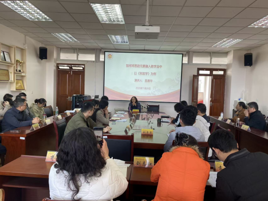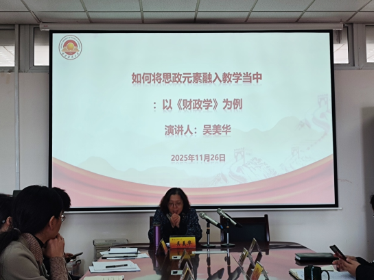 为进一步提升专业教学质量,推动教育教学改革实践,2025年11月26日,财政与税务学院组织开展“名师名课示范观摩”教研活动。此次活动邀请财税学院资深教授吴美华教师为全院教师带来题为《如何将思政元素融入教学当中:以《财政学》为例》的示范讲座。活动由财政与税务学院党委书记陈苏同志主持,学院领导班子和财政学系、税收学系全体专任教师共同参与了本次教研活动。