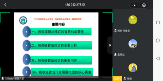5月8日上午,应财政与税务学院邀请, 国家税务总局扬州税务学院客座研究员,中国税务学会第七届学术研究委员会委员,总局首批征管制度专业人才库成员王明世老师通过腾讯会议为学院师生作了题为“税收征管法修订及前沿问题分析”的线上讲座。学院部分教师和19级税务专业硕士研究生等参加了讲座。