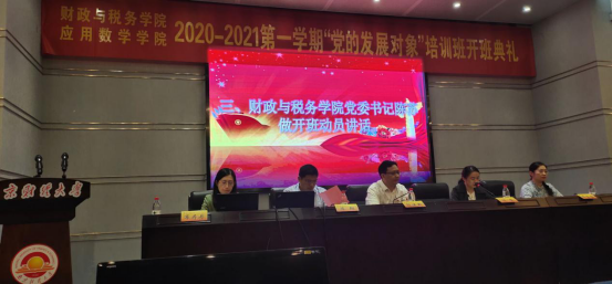 9月27日中午,财政与税务学院、应用数学学院联合开展的2020-2021学年第一学期“党的发展对象”培训班开班典礼在行政楼二楼报告厅举行。我院党委书记陈苏、副书记李慕原,马克思主义学院总支书记陈翔,应用数学学院党总支书记殷建新、院长助理布丹丹及全体党校学员参加了开班典礼。开班典礼由应用数学学院党总支书记殷建新主持。