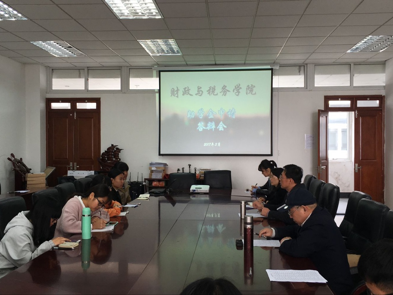3月29日上午,财政与税务学院在经济学科楼408会议室举办京州联信、卓成规划、文武人生等学院奖、助学金答辩会。23名申请各类助学金的2016级同学进行了申请答辩。学院党委书记张金龙、党委副书记陈苏、院校友办主任陆新葵、学工办主任全真真及全体辅导员老师参加,答辩会由2016级辅导员李玲老师主持。