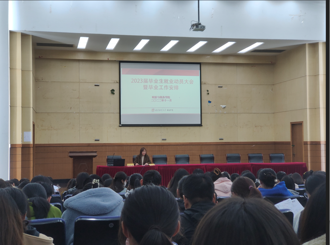 为切实做好毕业生就业指导工作,财政与税务学院2023届毕业生就业动员大会暨毕业工作安排会议于2022年11月22日下午两点在仙林校区德济楼报告厅举行。财政与税务学院党委副书记王翔、财政系主任叶兵、税收系老师刘家成、毕业班辅导员贾晓燕及财政与税务学院2019级全体学生参加活动。