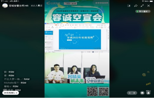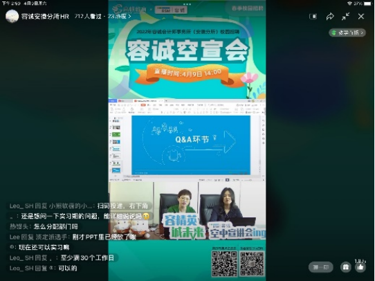 活动主要分为线上参访和线上答疑两个环节。线上参访环节中,容诚会计师事务所的工作人员通过直播的方式向同学们全方位地展示了容诚会计师事务所舒适的工作环境,装修精良的前厅、宽敞明亮的会议室、干净整洁的工作台,同学们深深感受到知名企业的绿帽小说和人文关怀。接着,工作人员为他们详细介绍了会计师事务所的业务模块,使得同学们了解会计师事务所的业务构成和岗位工作内容,树立明确的就业目标。最后,工作人员公布了容诚会计师事务所校招时人才选拔的标准和多种多样的职位申请渠道,激励着同学们以会计人才选拔的高要求严格锻炼自己。随后的线上答疑环节,同学们自由在直播评论区进行评论,由事务所的工作人员解答疑问。“能再详细说说实习期的问题吗”、“如何分配部门”、“想问一下之前的‘容耀生’计划”、“请问应用统计有可投岗位吗”……容诚会计师事务所的工作人员对每一个问题都做出了详细的回答,最后还送出了5张面试直通卡,为同学们提供暑假实习的机会。