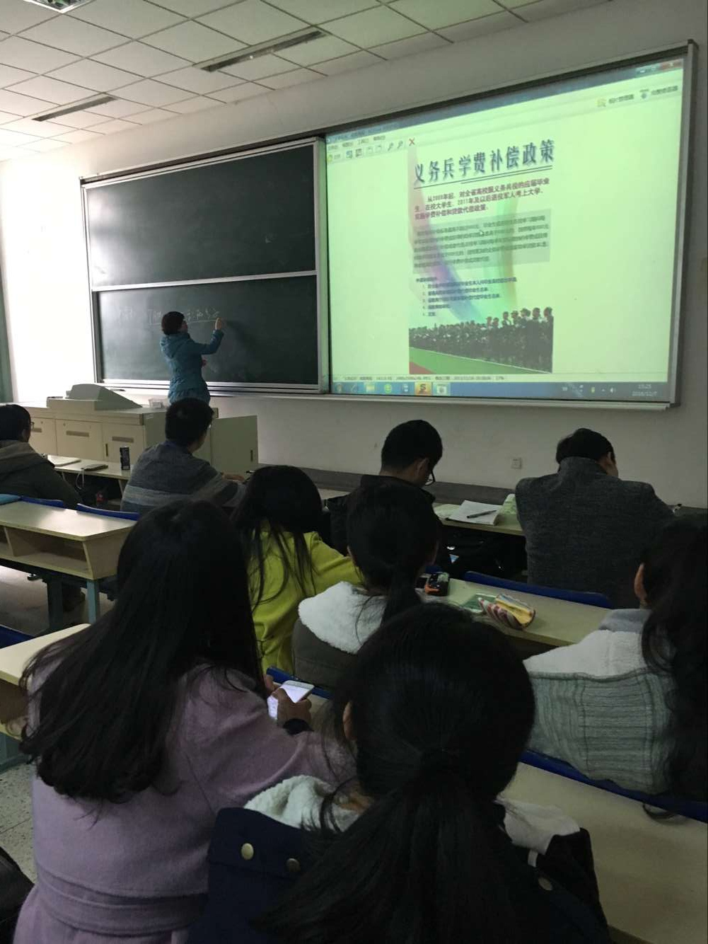 2016年3月20日,财政与税务学院在专二117教室举办义务兵学费补偿政策宣讲会。学院邀请熟悉义务兵学费补偿政策的辅导员李玲老师作政策宣传,为有志穿上戎装、献身国防的大学生提供政策支持。