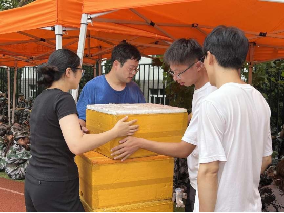 与此同时,南财大一新生和大二同学们正在烈日灼灼下进行军训学院老师们也来到军训现场为学生们送来了丝丝凉气的绿豆冰沙,在炎热的夏日驱赶着灼人的暑气,和同学们进行一场“双向奔赴”。操场中弥漫着绿豆清香,每一口都是满满的甜蜜和凉爽,仿佛能把所有的疲惫和炎热都一扫而空。在休息时间,同学们无拘无束的坐在草地中,享受着冰凉的绿豆沙,分享彼此的见闻,微风抚走脸上的汗珠,青春的笑颜比骄阳还耀眼。