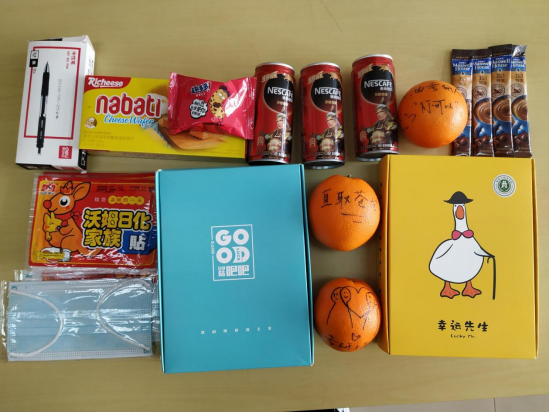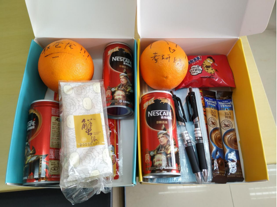 此次“暖冬送温暖”行动筹备了近一个月,从礼物的精心挑选、定制采购、创意图案的绘制,每一个礼物都包含学院师生的浓浓情义和深深祝福。简约大气的盲盒清新靓丽,而里面的礼品也让人耳目一新。橙子上写了“一研为定”、“鱼跃龙门”等等祝福话语,祝语旁可爱的简笔画令人忍俊不禁,寓意金榜题名的文具套装,驱赶严寒的暖宝宝给考研学子最有力的支持……收到“考研橙功鸭”盲盒的同学们纷纷表示受到了鼓励,将更加努力,不负大家的期望。