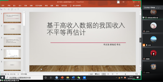 6月18日晚,应财政与税务学院、公共财政研究中心邀请,“江苏省青蓝工程优秀青年骨干教师”、中国收入分配研究院兼职研究员、我校经济学院李庆海副教授通过腾讯会议作了题为“基于高收入数据的我国收入不平等再估计”的学术讲座。讲座由财政与税务学院院长朱军教授主持,财政与税务学院部分教师和全体研究生参加了本次讲座。
