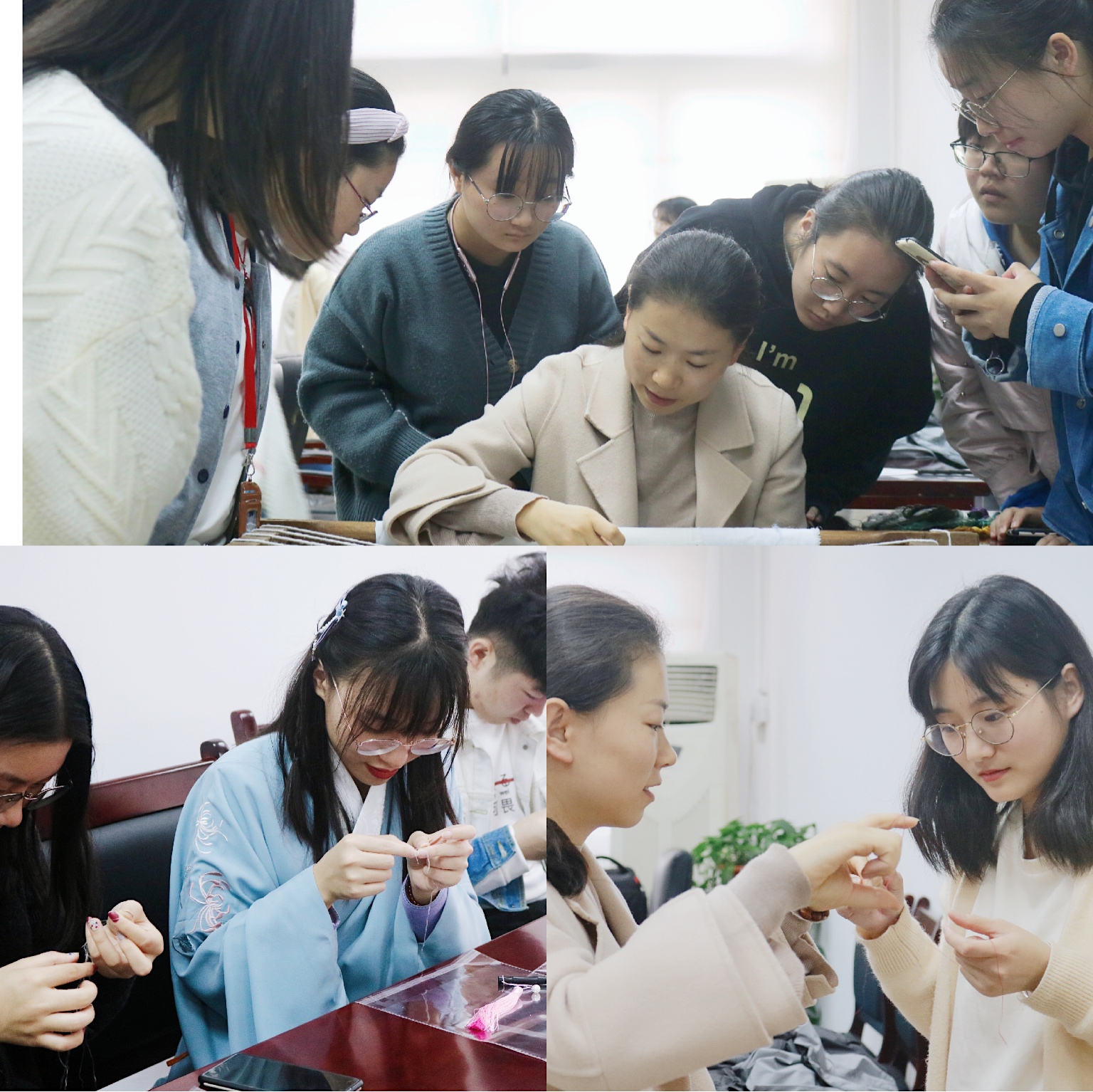 同学们一边在自己的扇面上尝试,一边就配色、针法等问题,频频向老师求教。来自印度尼西亚的留学生KUMALA CORNELIA(邱诗思)同学说:“看着容易,自己一上手就发现好难。小小的扇面、细细的针、细细的线可以有这么多种变化,真的感受到中华传统文化的魅力。”