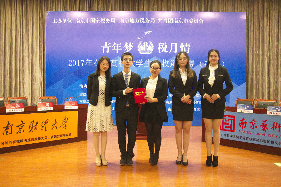 5月21日下午,由共青团南京委员会、南京市国家税务局、南京市地方税务局主办的“2017年在宁高校大学生税收辩论赛”决赛在鼓楼区国家税务局会议大厅举行。由我校财政与税务学院指导的我校代表队一路过关斩将,击败了南京大学、东南大学、南京审计大学等强队,与南京艺术学院代表队会师决赛,并以优异的现场表现捧得总冠军奖杯,取得了十年来我校参加此项赛事的最好成绩。