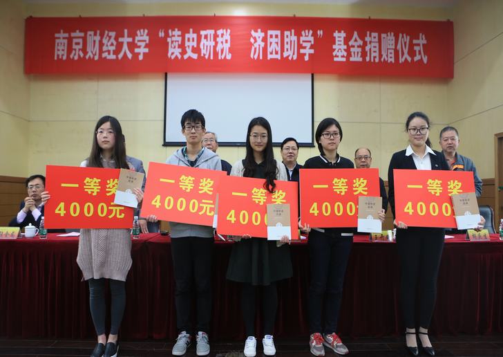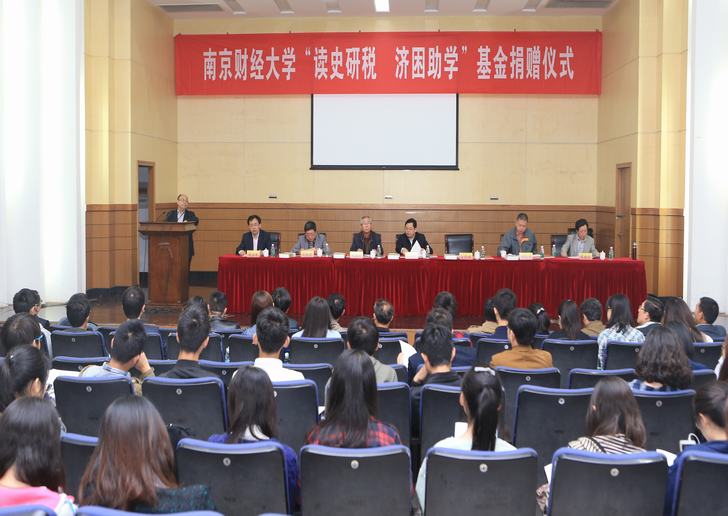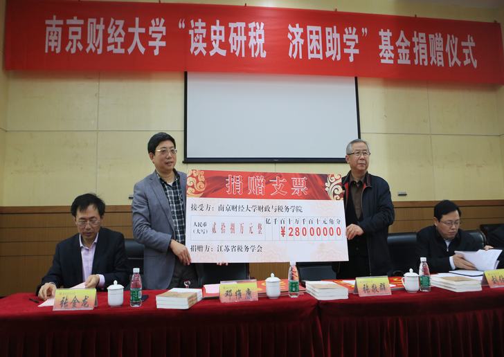 “读史研税济困助学基金”由江苏省国家税务局原党组副书记、副局长、江苏省税务学会常务副会长张敬群先生捐资设立,定向资助财政与税务学院家庭经济困难、品学兼优的学生,资金来源为张敬群先生所著《中国税史品读》的全部稿酬28万元。