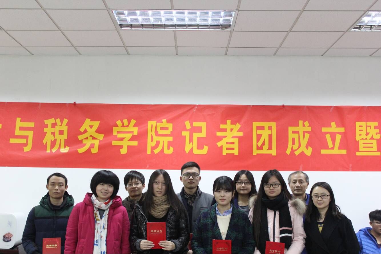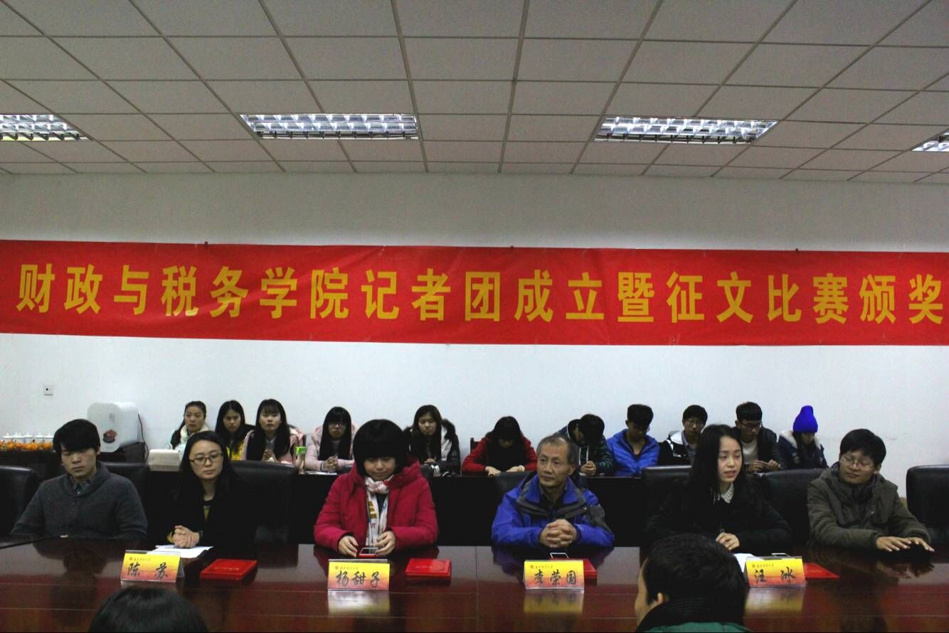 2015年12月9日下午,财政与税务学院记者团成立暨征文比赛颁奖仪式在专一408会议室举行,《扬子晚报》科教卫部记者杨甜子老师、校宣传部李荣国老师、我院党委副书记陈苏老师出席仪式,仪式由学生会副主席汪冰主持。