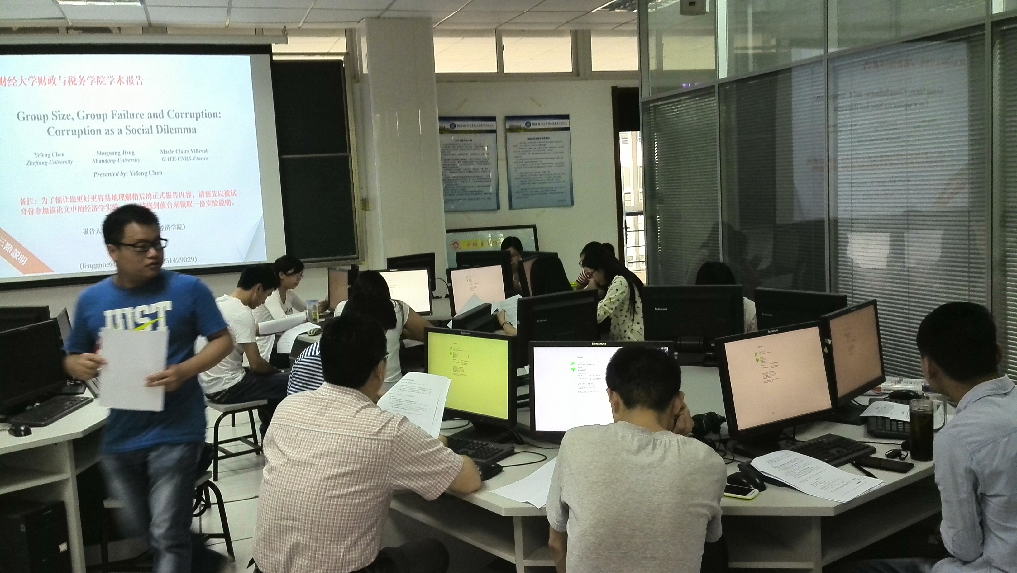 陈叶烽副教授此次讲座在财政与税务学院实验室举行,整个讲座的过程分为两个主要模块,首先是从8:40开始到10:30结束的基于讲座论文的互动实验Ztree软件使用。在实验开始前,8点40开始,陈叶烽副教授向每位参与实验的人员发放了实验说明,并认真讲解了实验规则,每位实验参与者还就实验规则的理解做了一个测试,以此判断是否真正明白实验规则,确保每位成员实验的有效性。实验过程由“彩票选择”、“官企博弈”两部分组成,整个实验过程严谨有趣,参与实验的同学及老师认真的完成了整个实验的过程。