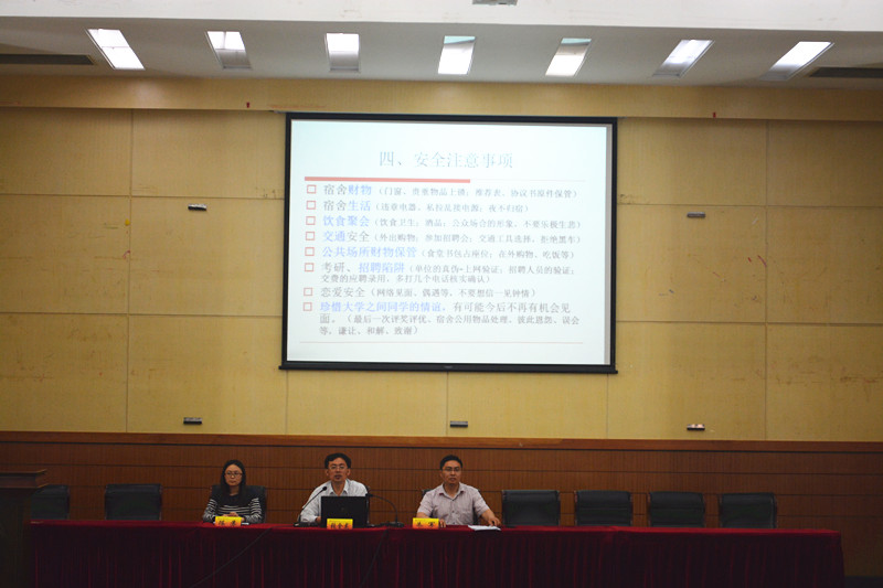 张金龙书记指出,作为大四即将毕业的学生,在快要离开校园之际,要珍惜最后的在校时间。毕业期间的安全是不可忽视的问题。提醒大家毕业聚餐等活动不能过度饮酒。张书记同时强调了就业的重要性。对于一些有就业能力而犹豫不决,在等待中丧失就业机会的同学,他提醒大家要明确自身的职业规划。