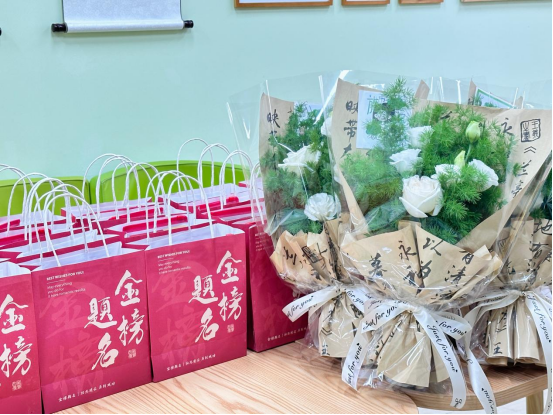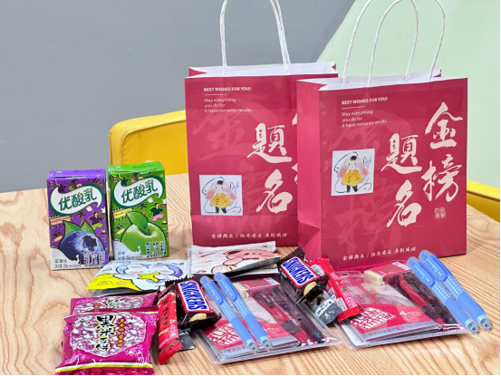 “放‘青松’,‘紫’定行”礼包上不仅带有代表我院的元素、特色,也有为契合本次活动主题特意定制的标语。“笔”是考试中不可或缺的一份子,一根根精美的以紫色为表的签字笔,是希望考研学子在考试期间能够“下笔如有神”,“紫”定能行;放青松花束更是礼物包里的“重头戏”,将“青松”放入花束,更是希望考研学子能够放轻松,相信他们凭借一路以来的努力可以换来明日的成功,士力架、咖啡、美食这些常见的“助力剂”,令考研学子可以以最饱满的精神状态去迎接考试,大鹏一日同风起,扶摇直上九万里!