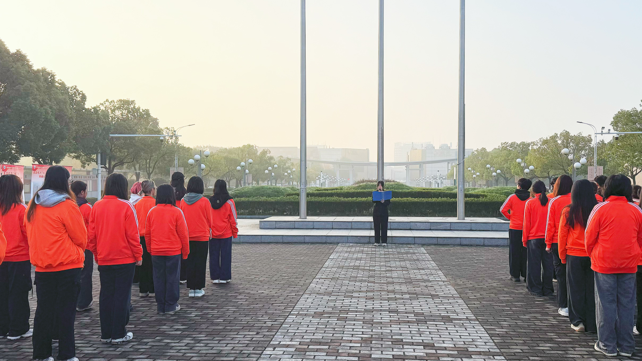 在肃穆的升旗仪式中,国旗护卫队步伐铿锵,五星红旗在晨光中冉冉升起。在场学子肃立行礼,高唱国歌,展现出新时代财税学子昂扬的精神风貌。