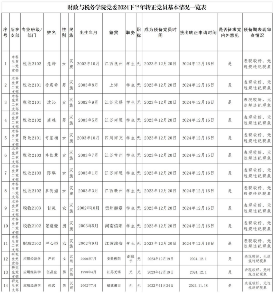 财政与税务学院危婷等14名同志预备期满,为了广泛听取群众意见,接受群众的监督,现予以公示,公示时间为2024年12月16日至12月22日。